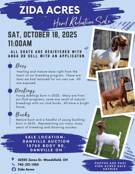UPCOMING SPECIAL LIVESTOCK SALE Zida Acres Herd Reduction Sale October 18, 2025 as part of the Big Bred Doe Sale ![]() |